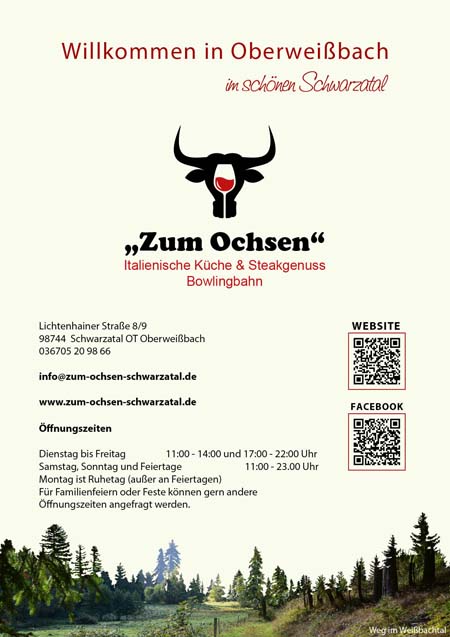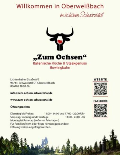 Willkommen im Restaurant „Zum Ochsen“ in Oberweißbach. Sie genießen bei uns italienische Köstlichkeiten wie Pizza, Pasta, Fleisch- und Fischgerichte. Je nach Jahreszeit variieren die Saisonangebote.