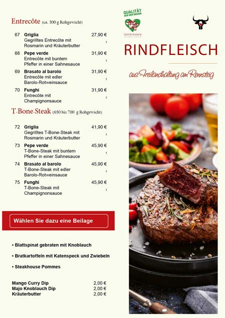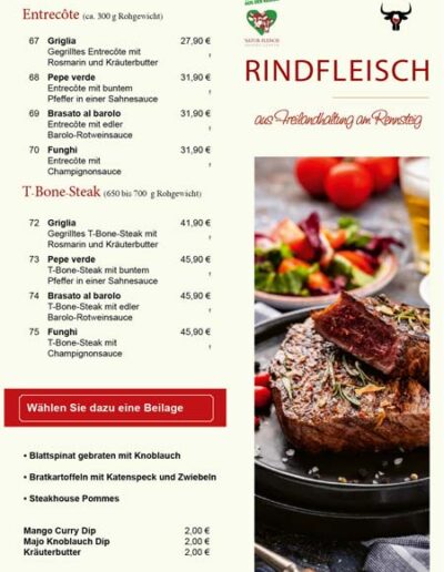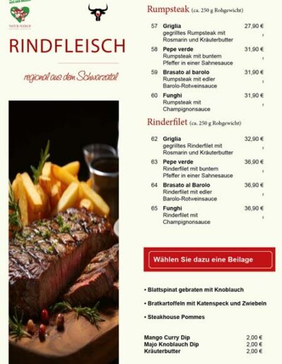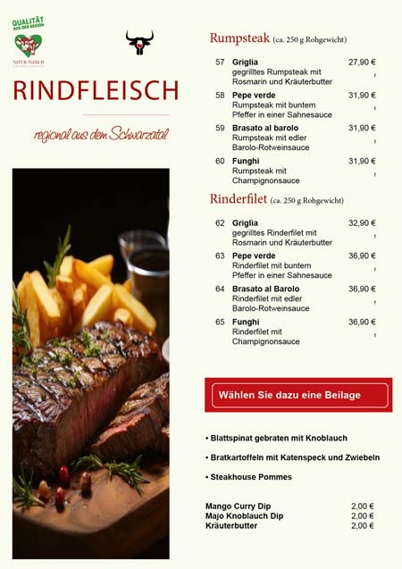 Besonders gerne bereiten wir Ihnen leckere Steak-Spezialitäten zu; das Fleisch kommt direkt hier aus dem Schwarzatal.